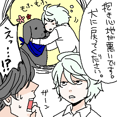 1月30日の日記に載せたわんわんパトロール犬のステファン君(黒ラブ・♂)について、拍手より「ステ犬はニアのキスで人間に戻る」というコメントをいただき、それについて昼休み弁当食べながら妄想してたらとても楽しかったので絵にしてみました。