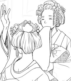 手前の舞妓さんは図書館から借りてきた写真集に載ってた柄を拝借して描きました。
