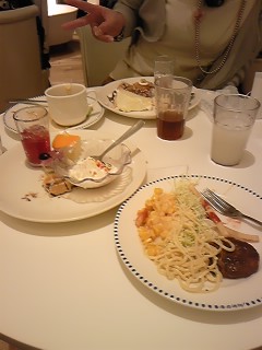 向いは友人、手前の汚く食い散らかしてる2皿がわたしの皿です。